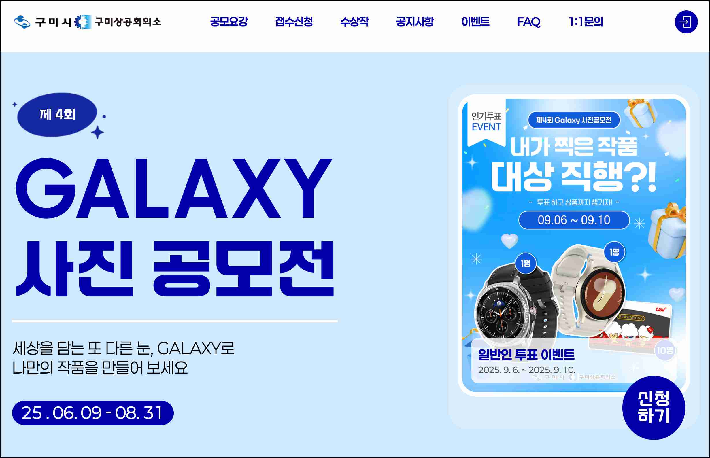 응모 주제는 세 가지로 나뉩니다. 전국을 대상으로 한 '나의 일터와 일상', 구미의 명소나 문화를 주제로 한 '구미 부문', 그리고 삼성과 갤럭시를 담은 ‘특별주제’가 있어요. 청소년 부문은 비교적 자유롭게 일상과 감성을 표현할 수 있는 주제로 구성돼 있어서, 중고등학생도 충분히 참여할 수 있습니다.