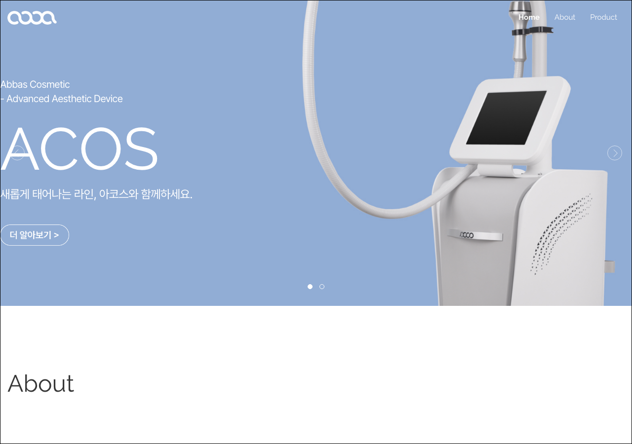 abba-s.com은 Abbas Cosmetic이라는 이름으로 운영되는 미용 기기 전문 사이트입니다. 첨단 에스테틱 디바이스를 소개하고 있는데요, 메인 페이지에서 ACOS라는 제품을 중심으로 브랜드 철학과 기술력을 보여주고 있어요. 아임웹 기반으로 깔끔하게 구성되어 있고, 전체적으로 세련된 디자인이 눈에 띕니다. 미용 업계 종사자분들이나 에스테틱 장비에 관심 있으신 분들이라면 한번쯤 들어가 볼 만한 사이트예요. 회사 소개와 제품 정보를 한눈에 확인할 수 있도록 구성되어 있어서 보기 편하더라고요.
