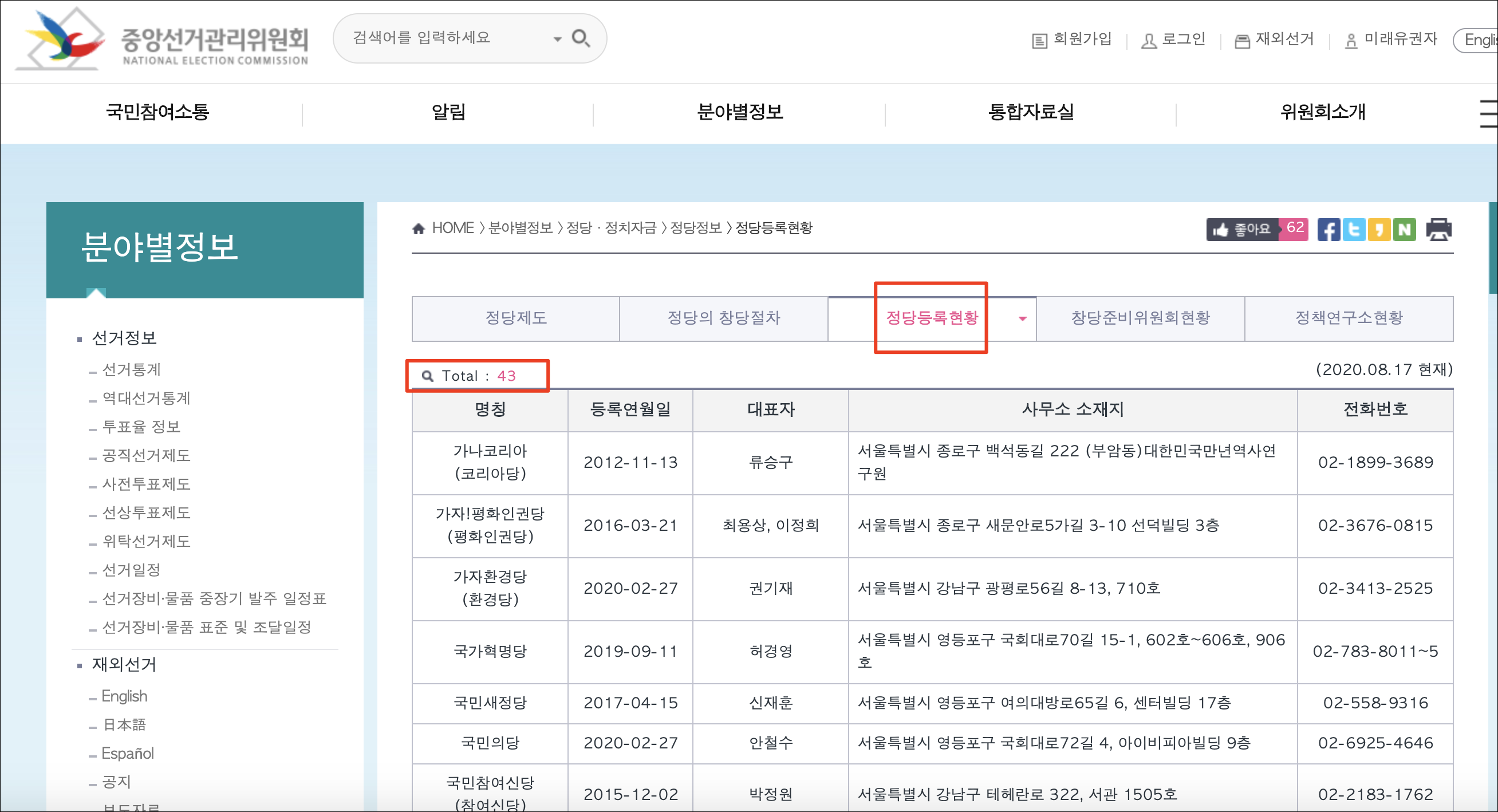 현재 우리나라에 정식 등록된 정당이름 목록은 위 중앙선거관리위원회 홈페이지에서 확인할 수 있습니다. 2020년 8월 기준으로 43개의 정당이 등록되어 있습니다.