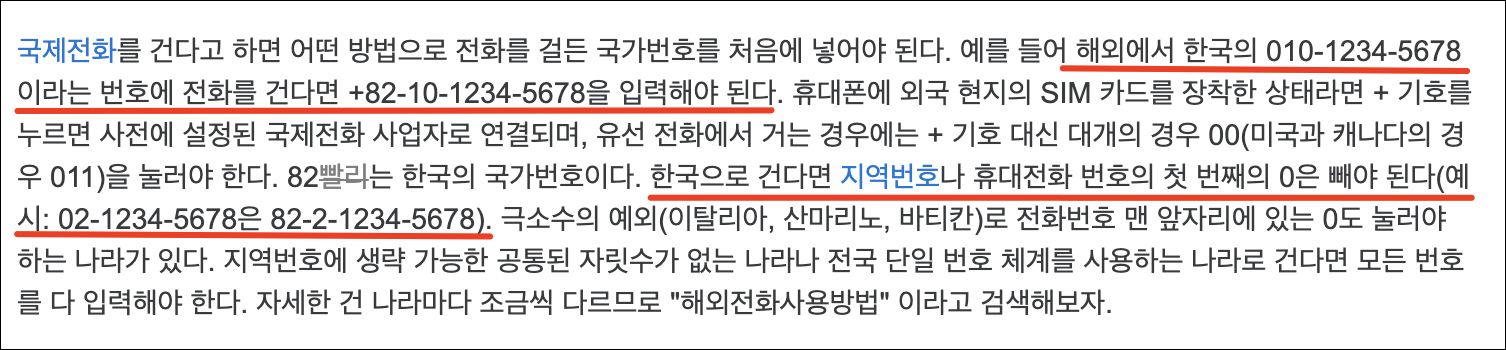 해외에 나가서 한국으로 핸드폰번호 (010-1234-5678)로 전화를 걸려고 한다면 "82-10-1234-5678" 로 걸면 됩니다. 국가번호 "82"를 먼저 입력하고 "010" 에서 앞에 "0"을 생략하고 "10"만 넣고, 나머지 번호를 넣으면 됩니다. 011로 전화를 건다면 "011-82-10-1234-5678" 이 되겠네요.