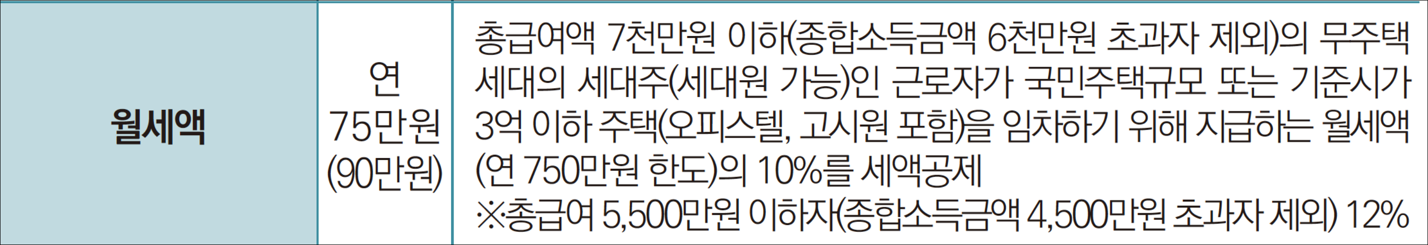 2020년 귀속 연말정산을 위한 교육자료중에서 월세액 공제 부분을 발췌해보면 위와 같아요. 총급여액이 7천만원 이하이고 종합소득금액이 6천만원 이하여야만 대상이 됩니다. 월세액 (연 750만원 한도)의 10%에 대해서 공제가 됩니다. 만약 총급여가 5,500만원 이하라면 공제율이 12%로 좀 더 올라갑니다.