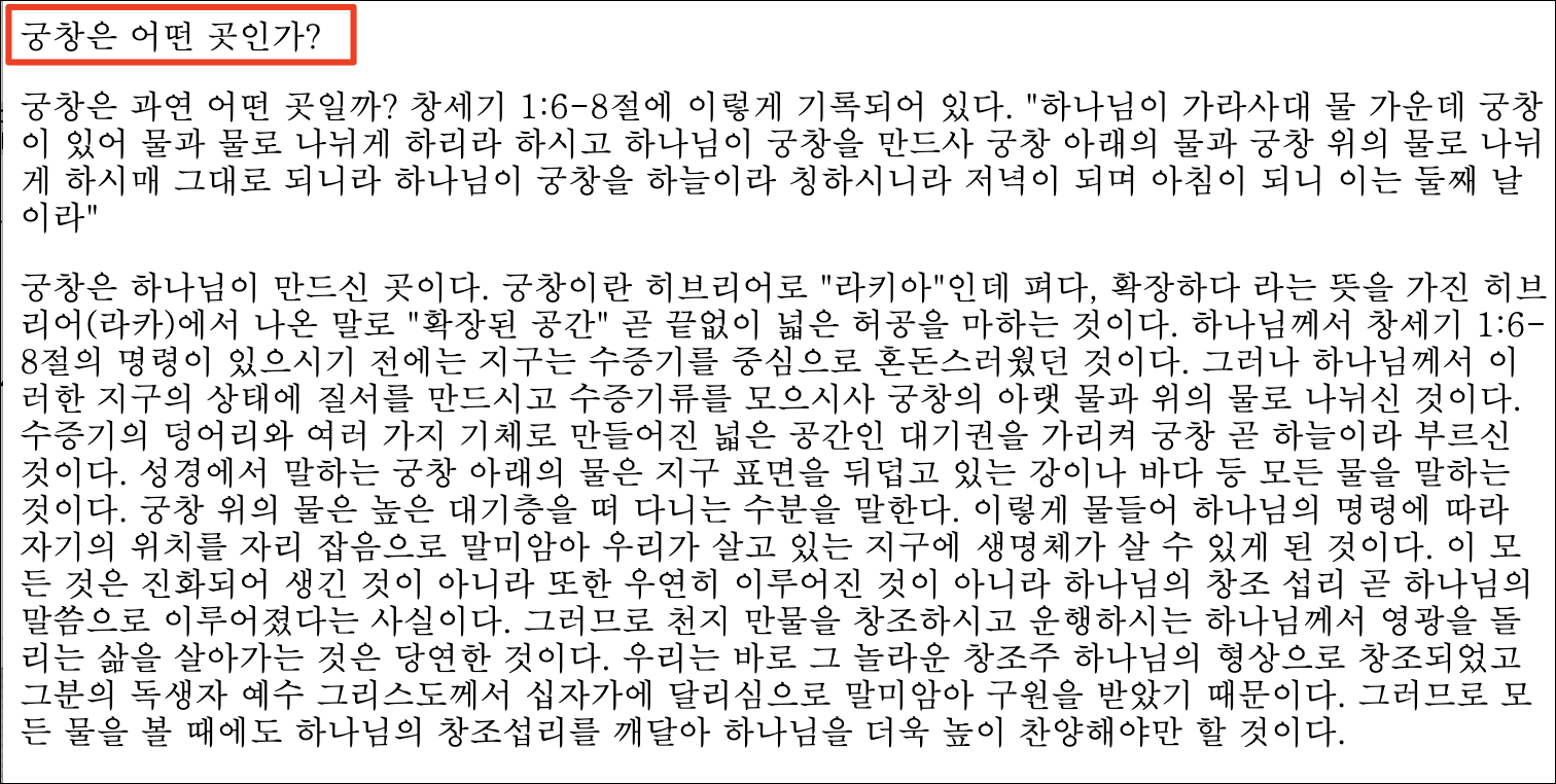 궁창은 어떤 곳인가? 궁창은 과연 어떤 곳일까? 창세기 1:6-8절에 이렇게 기록되어 있다. "하나님이 가라사대 물 가운데 궁창이 있어 물과 물로 나뉘게 하리라 하시고 하나님이 궁창을 만드사 궁