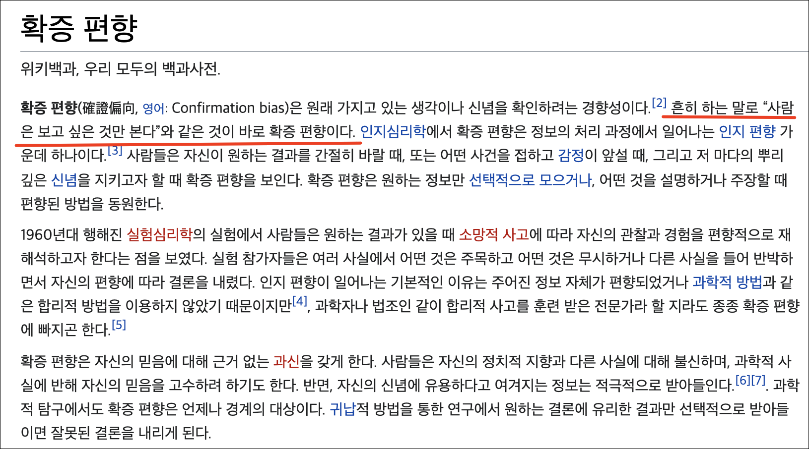 인간은 보고 싶은것만 보려고 하는 경향이 있는데, 이를 '확증편향' 이라고 합니다.