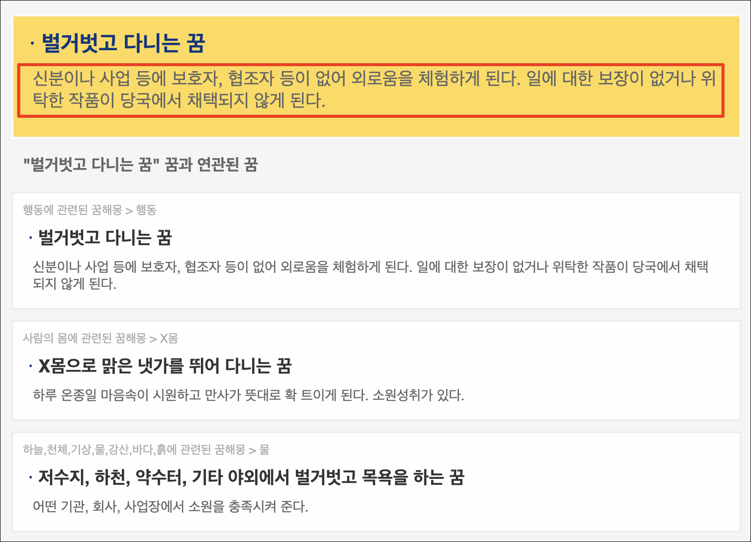 벌거벗고 다니는 꿈은 '사업을 할 때 협조하는 사람이 없이 외로움을 체험하게 될' 꿈이라고 하니 그닥 좋지 않네요.