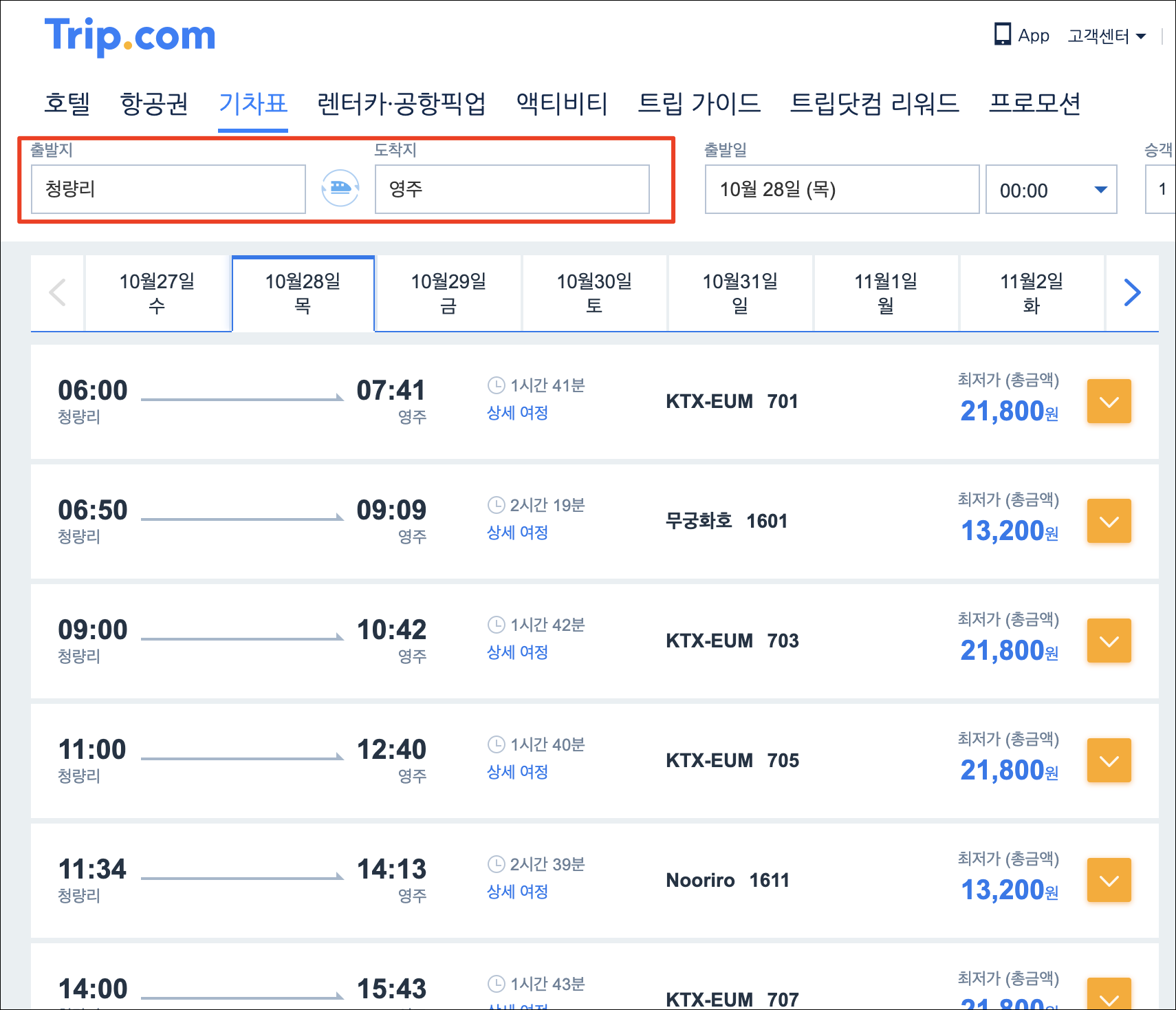 청량리발 영주행 기차표 온라인 예약 & 배송 | 트립닷컴