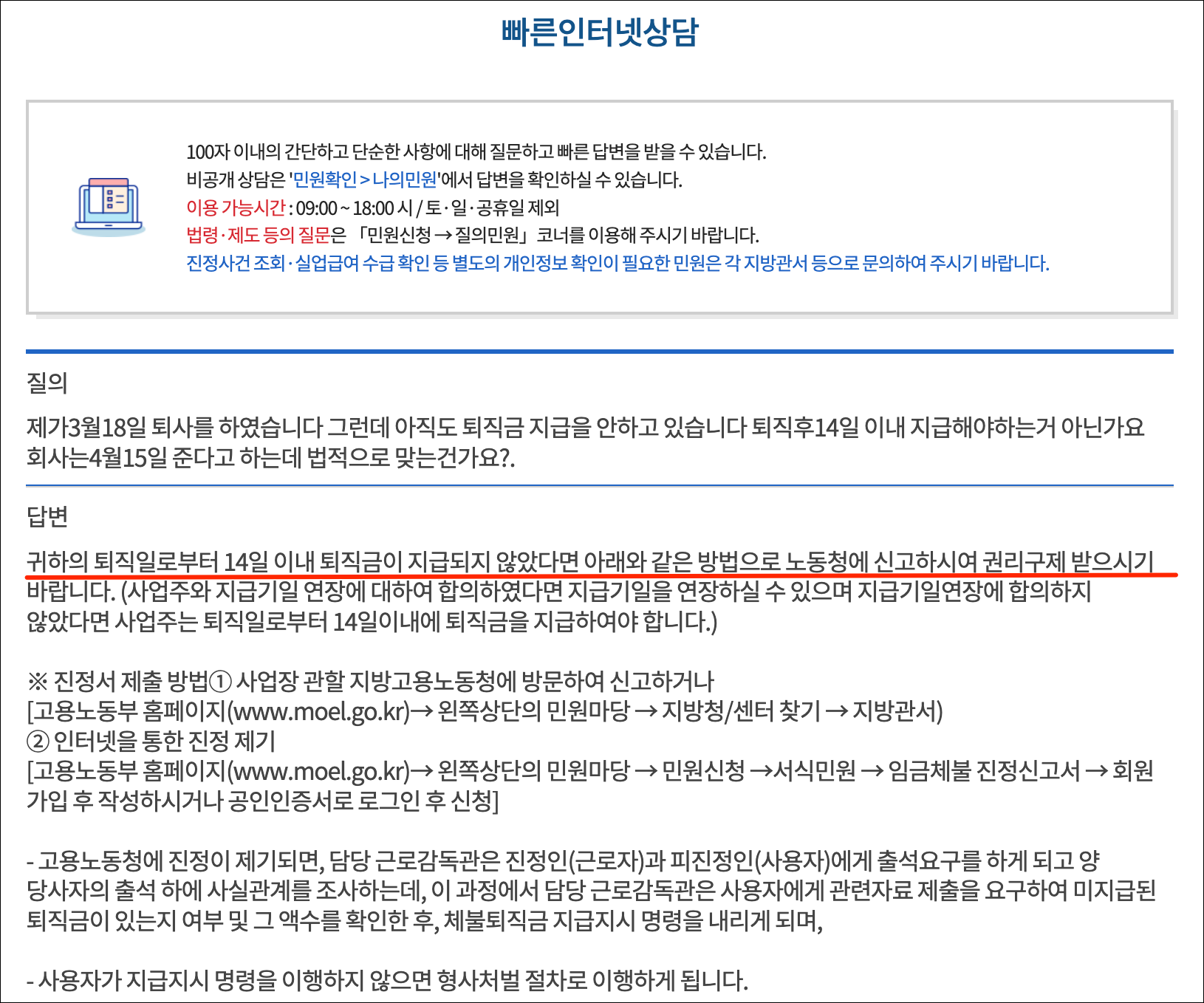 만약에 사업주와 지급기일 연장에 대해 합의를 하지 않았다면, 퇴직일로부터 14일 이내에 지급해야 합니다.