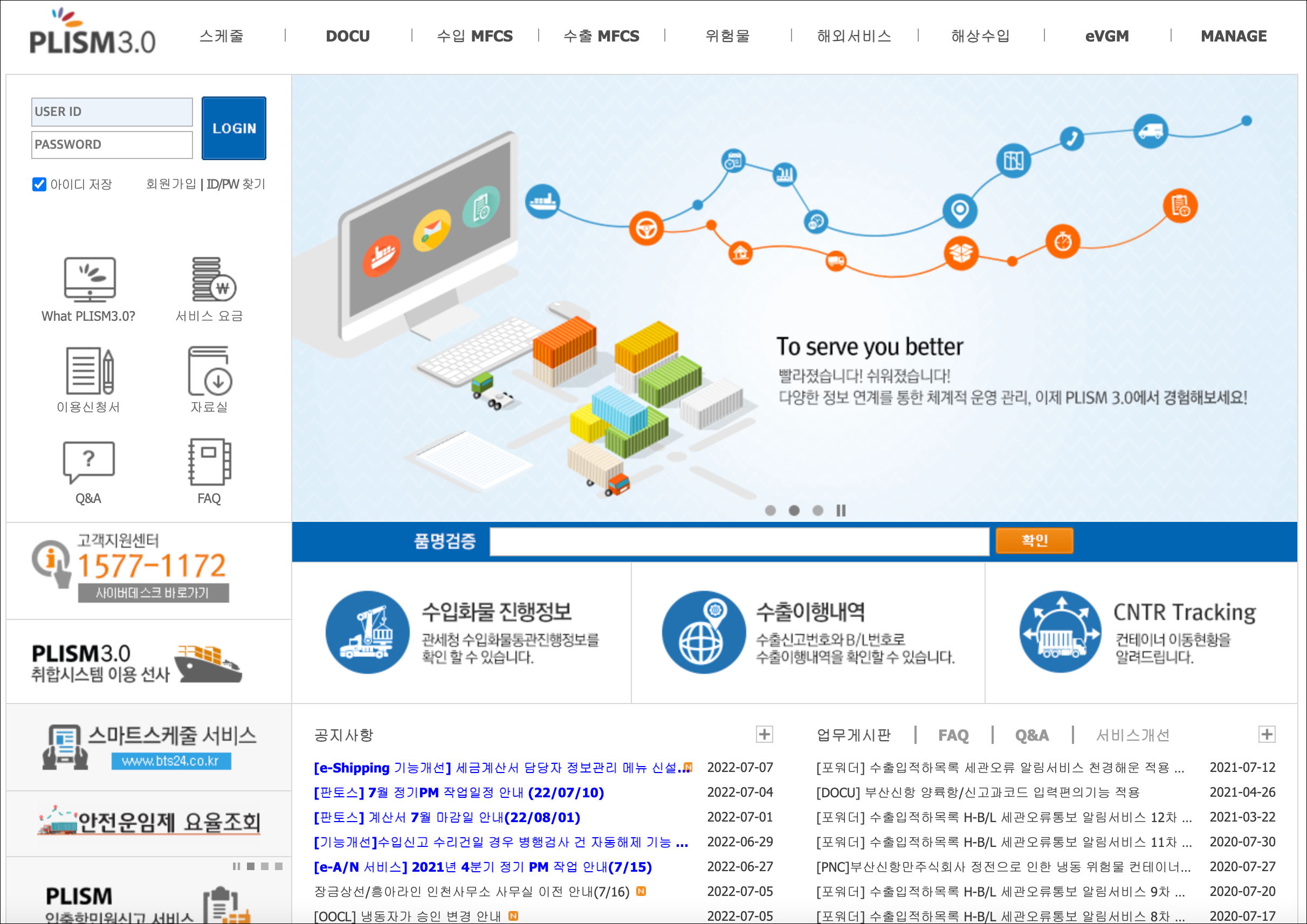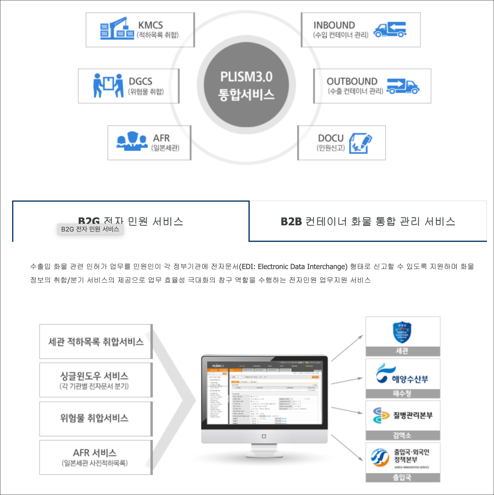 B2G 전자민원신고 및 B2B 컨테이너 통합 관리 시스템을 통합하여 민원인이 항만물류의 모든 업무를 하나의 사이트에서 처리할 수 있도록 지원하는 개념의 '물류 ONE-STOP 서비스'입니다.