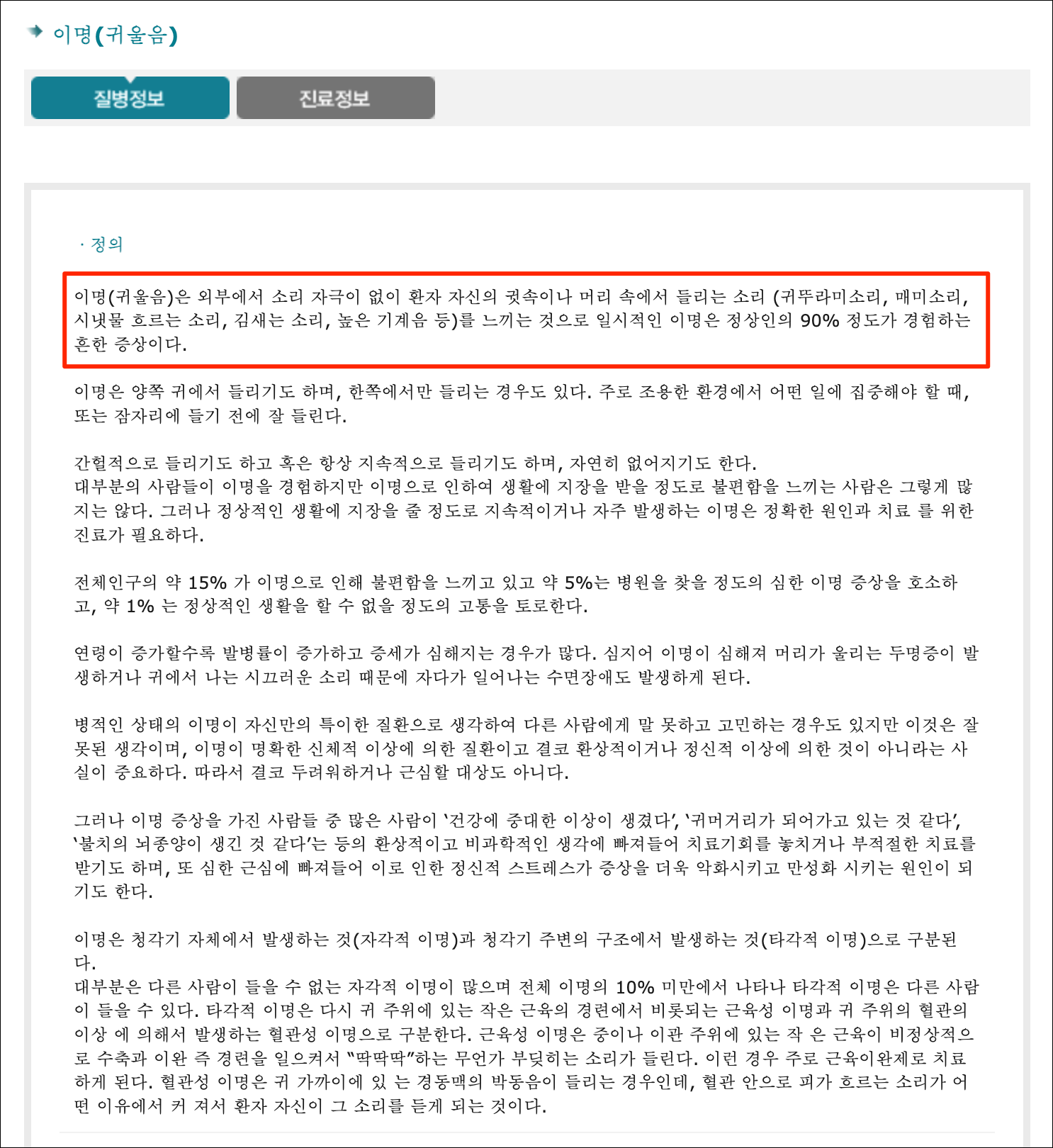 이명(귀울음)은 외부에서 소리 자극이 없이 환자 자신의 귓속이나 머리 속에서 들리는 소리 (귀뚜라미소리, 매미소리, 시냇물 흐르는 소리, 김새는 소리, 높은 기계음 등)를 느끼는 것으로 일시