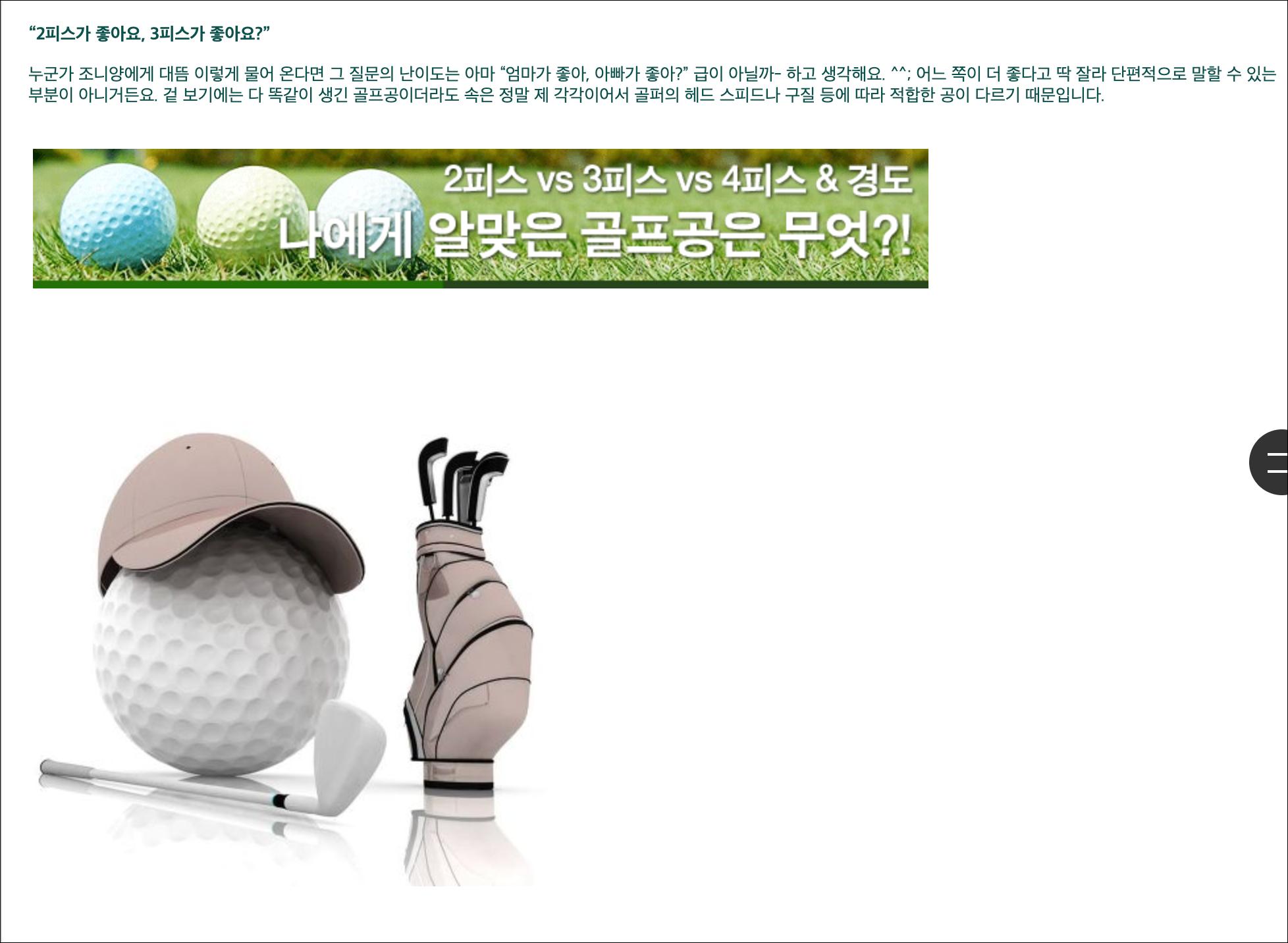 골프공을 구매할 때 보통 2피스, 3피스 중에서 고민을 하게 되는데요, 각각 어떤 장단점이 있는지 이 글을 보고 자세히 알게 되었어요. 흔히들 피스가 올라갈수록 좋은거라고만 알고 있었는데, 2피스는 그만의 장점이 있었네요. 특히나 초보 골퍼의 경우는 2피스를 사용하게 되면 거리에서 이점이 있고, 슬라이스와 훅구질이 완화되는 성질이 있으니 오히려 더 유리할 것 같습니다.