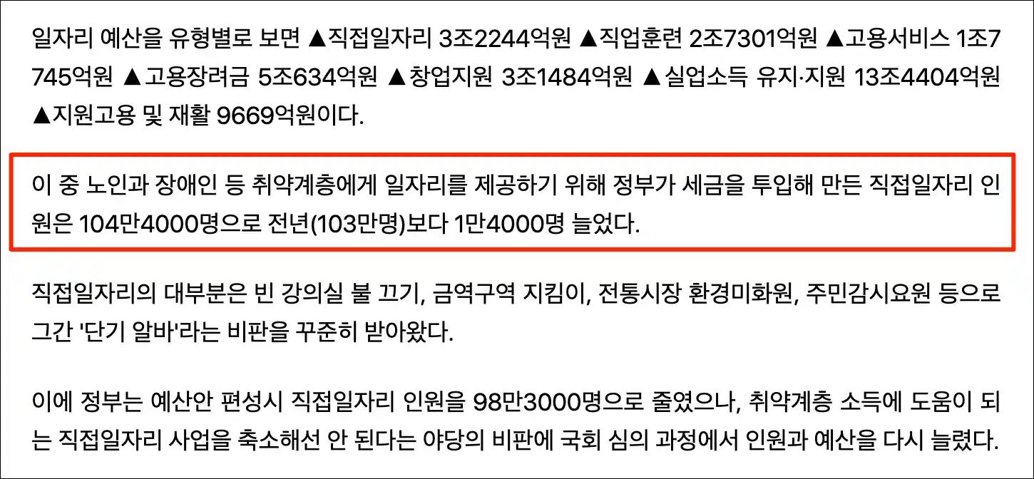 노인과 장애인 등 취약계층에서 세금으로 직접 일자리를 제공하는 예산은 전년도 103만명보다도 1만 4천명이 늘어서 104만 4천명이 되었습니다. 정부 예산안에서는 98만 3천명으로 줄었었지만, 국회를 통과하면서 다시 6만 1천개가 늘어서 최종 104만 4천명이 되었네요.