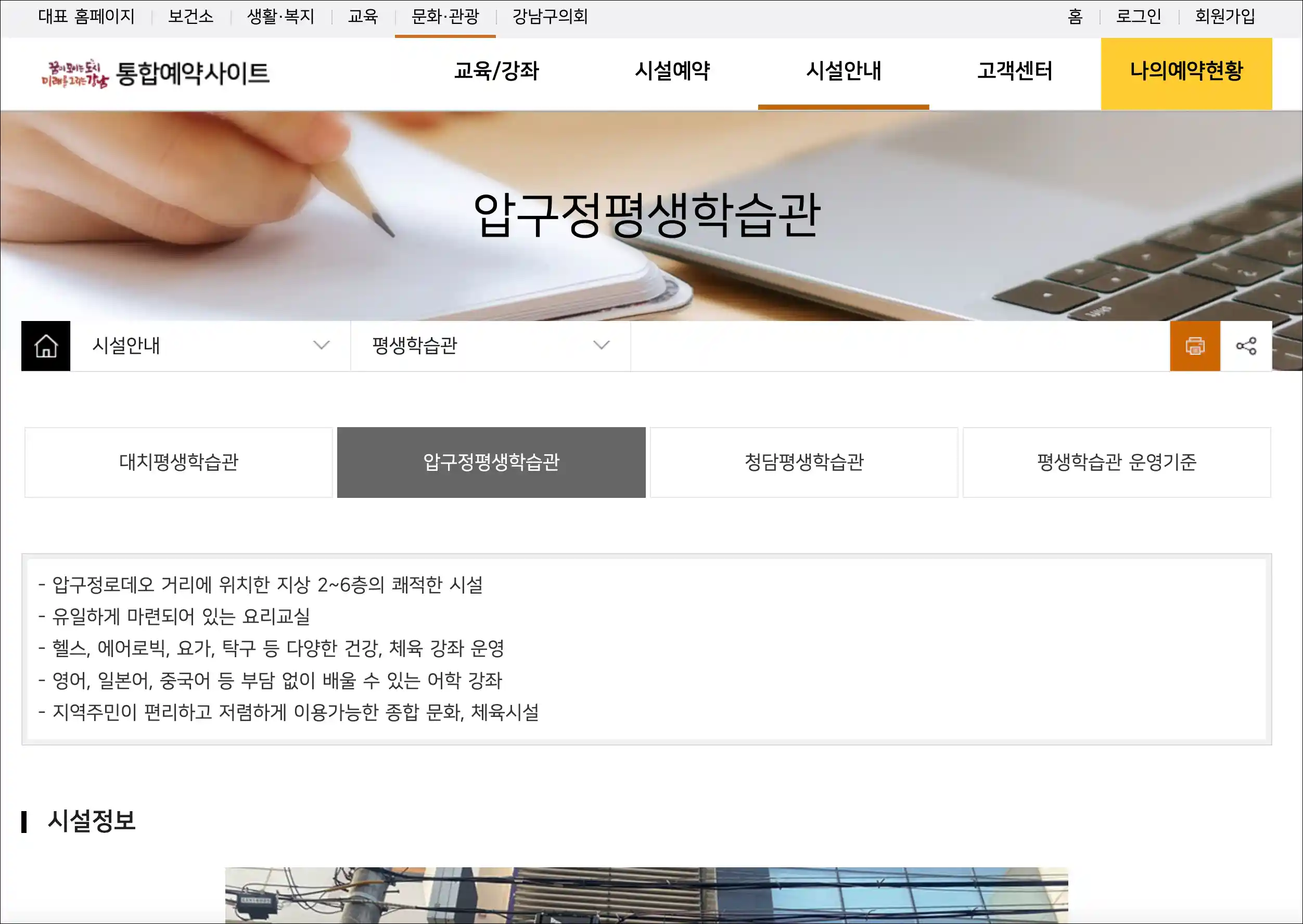 압구정평생학습관 < 평생학습관 < 시설안내 : 강남구 통합 예약 사이트