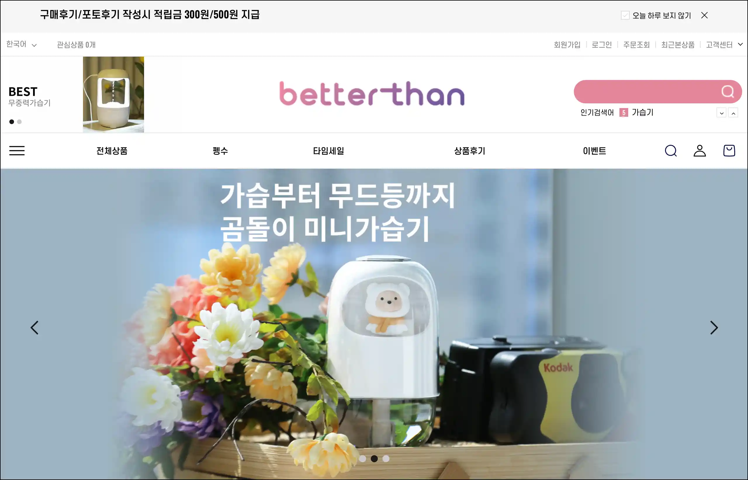 베러댄은 다양한 생활용품을 판매하는 온라인 쇼핑몰입니다. 주요 상품으로는 가습기, 미니세탁기, 어린이 안전벨트가드 등이 있으며, 이들 상품은 일상 생활에서의 편의를 제공합니다. 사이트는 회원가입 시 무료배송 쿠폰 제공, 구매후기 및 SNS 포토리뷰 작성 시 적립금이나 상품권을 지급하는 등의 혜택을 제공합니다. 타임세일, 이벤트, 신상품 소개 등 다양한 프로모션을 통해 고객의 구매를 유도합니다. 대상 사용자는 생활용품에 관심 있는 온라인 쇼핑몰 이용자입니다.