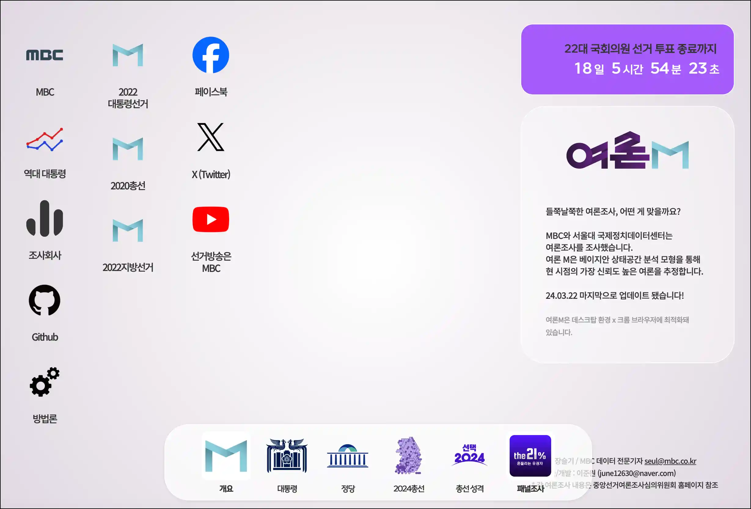 '여론M'은 MBC와 서울대 국제정치데이터센터가 공동 운영하는 여론조사 분석 사이트입니다. 베이지안 상태공간 분석 모델을 활용해 현재 가장 신뢰할 수 있는 여론을 추정합니다. 주로 대통령 국정수행 평가, 정당 지지도 등의 정치적 여론을 다루며, 여론조사 결과는 중앙선거여론조사심의위원회의 자료를 기반으로 합니다. 조사 방법에는 자동응답(ARS)과 전화면접 등이 포함되어 있습니다.
