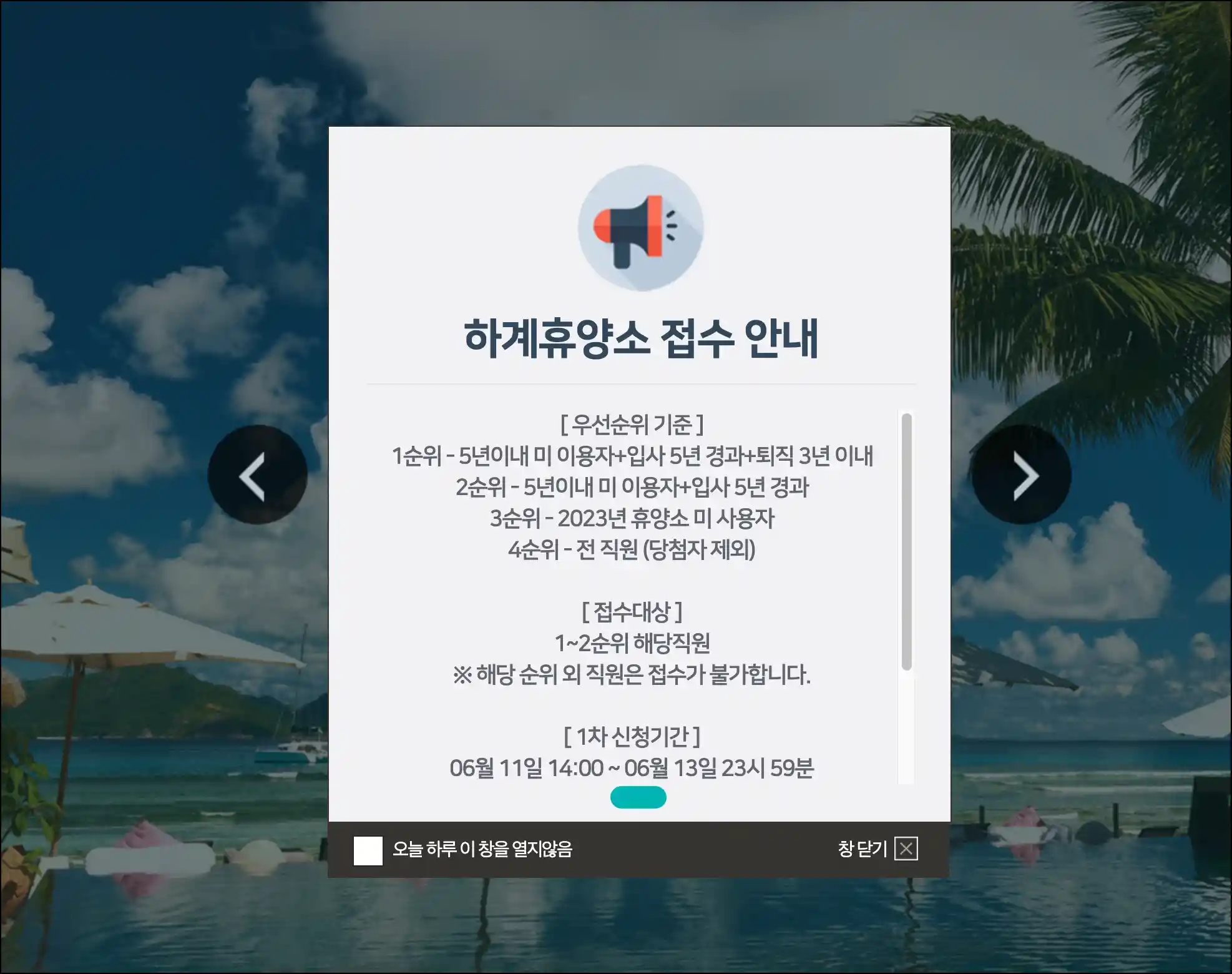국민건강보험공단의 하계 휴양소 접수 사이트입니다. 사이트에서는 직원들을 위한 하계 휴양소 접수와 관련된 정보를 제공합니다. 로그인은 사번을 이용하며, 접수 우선순위 기준과 신청 기간, 당첨 발표 등 자세한 절차를 안내합니다. 접수 대상자는 우선순위에 따라 결정되며, 문의는 발주부서로 할 수 있습니다.
