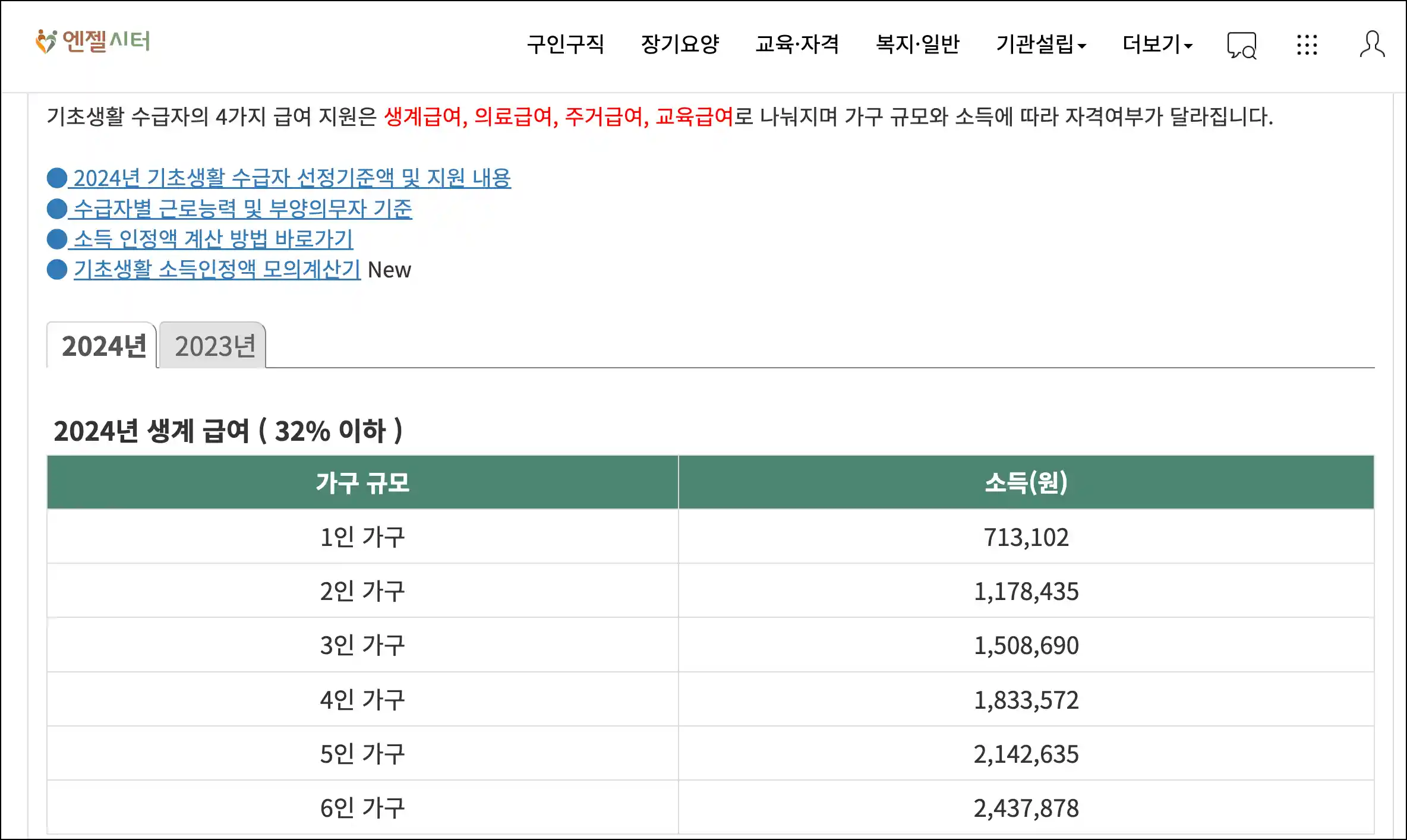 가구당 소득액에 따른 생계급여, 의료급여, 주거급여, 교육급여 자격 조건, 기준 중위소득 등