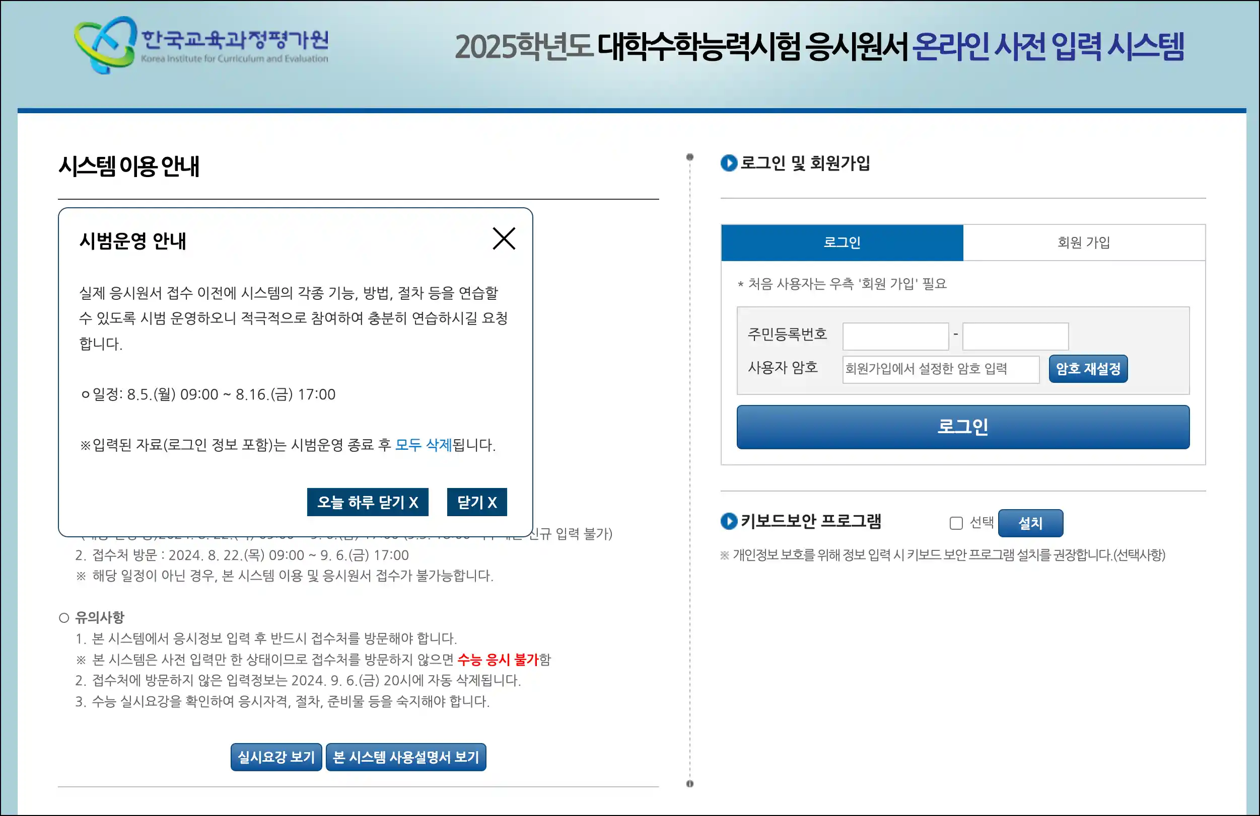 2025학년도 대학수학능력시험 응시원서 온라인 사전 입력 시스템