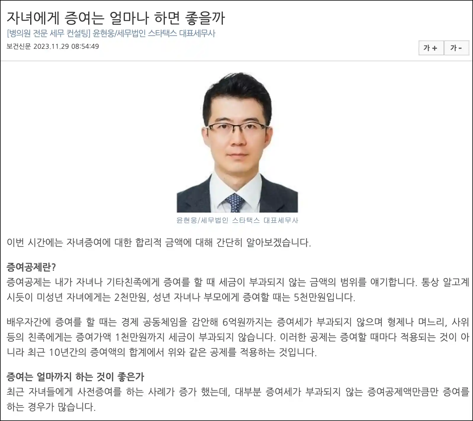 윤현웅/세무법인 스타택스 대표세무사 이번 시간에는 자녀증여에 대한 합리적 금액에 대해 간단히 알아보겠습니다. 증여공제란? 증여공제는 내가 자녀나 기타친족에게 증여를 할 때 세금이 부