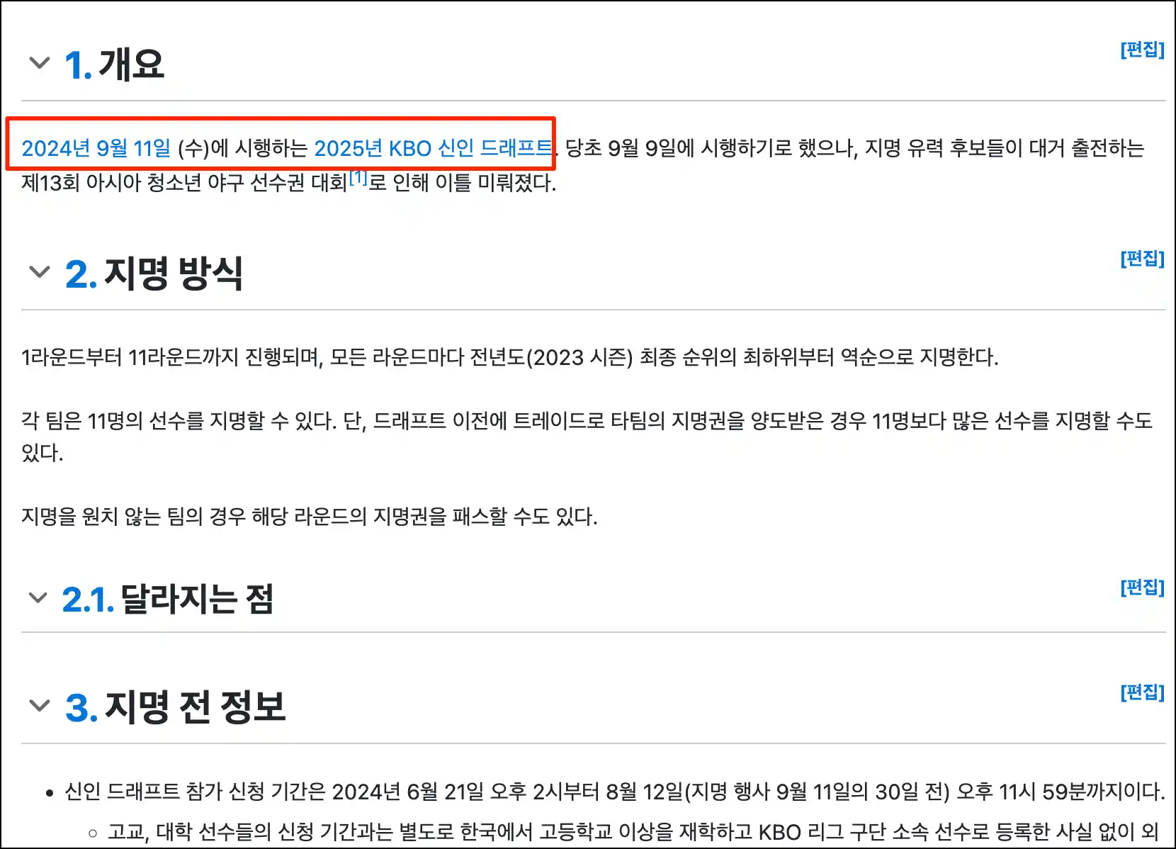 2024년 9월 11일 (수)에 시행하는 2025년 KBO 신인 드래프트 . 당초 9월 9일에 시행하기로