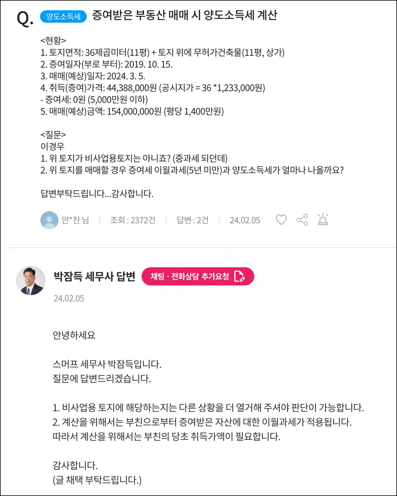 증여받은 부동산 매매 시 양도소득세와 관련된 상담 사례를 다루고 있습니다. 질문자는 증여받은 부동산의 매매와 관련해 비사업용 토지 여부 및 예상 양도소득세와 증여세 계산법을 문의했으며, 이에 대한 세무사의 답변이 포함되어 있습니다. 답변에는 비사업용 토지 판별과 양도소득세 계산 절차, 증여세 이월과세 조건이 설명되어 있어 세금 부담을 예측하는 데 유용한 정보를 제공합니다.