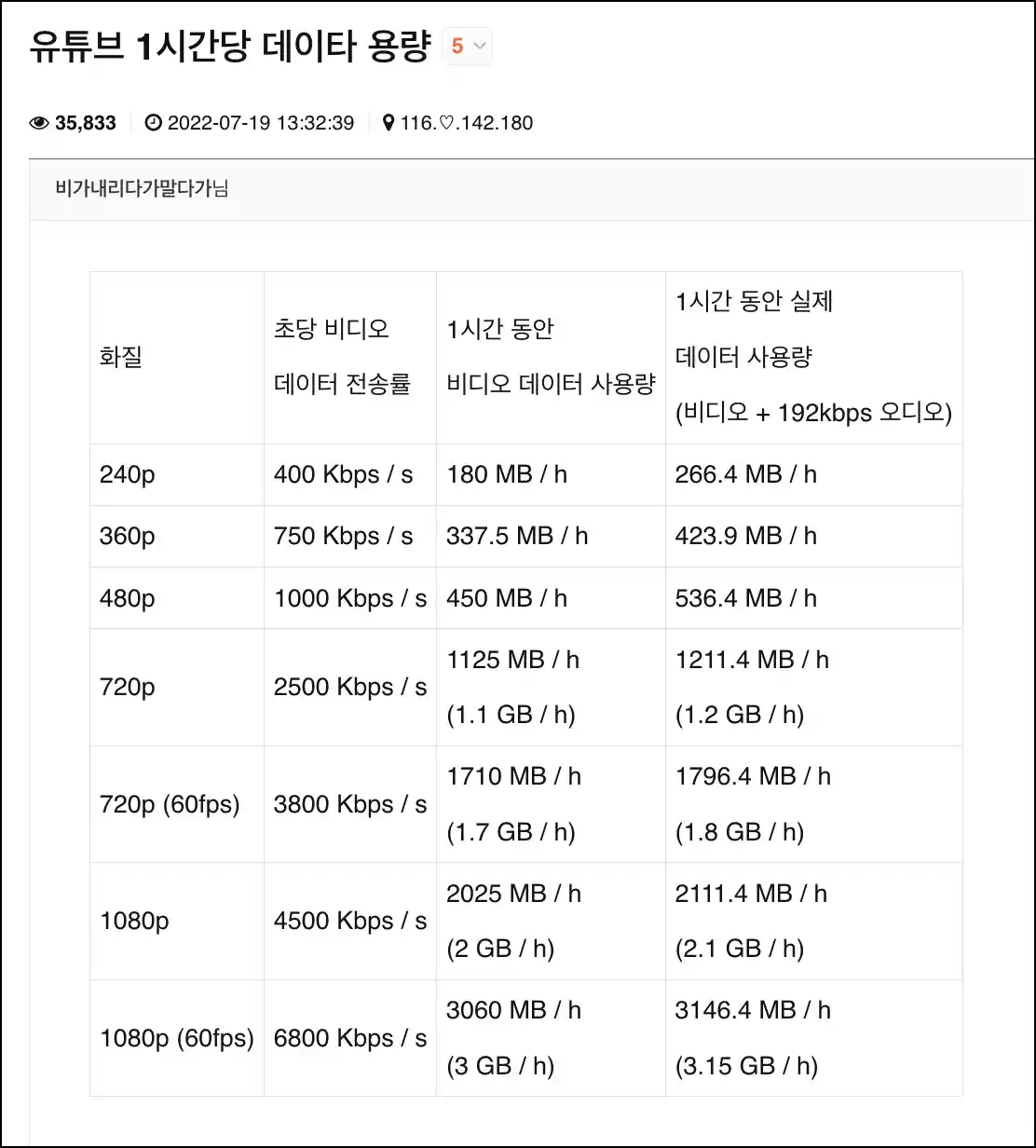 화질 초당 비디오 데이터 전송률 1시간 동안 비디오 데이터 사용량 1시간 동안 실제 데이터 사용량 (비디오 + 192kbps 오디오) 240p 400 Kbps / s 180 MB / h 266.4 MB / h 360p 750 Kbps / s 337.5 MB / h 423.9 MB / h 480p 10