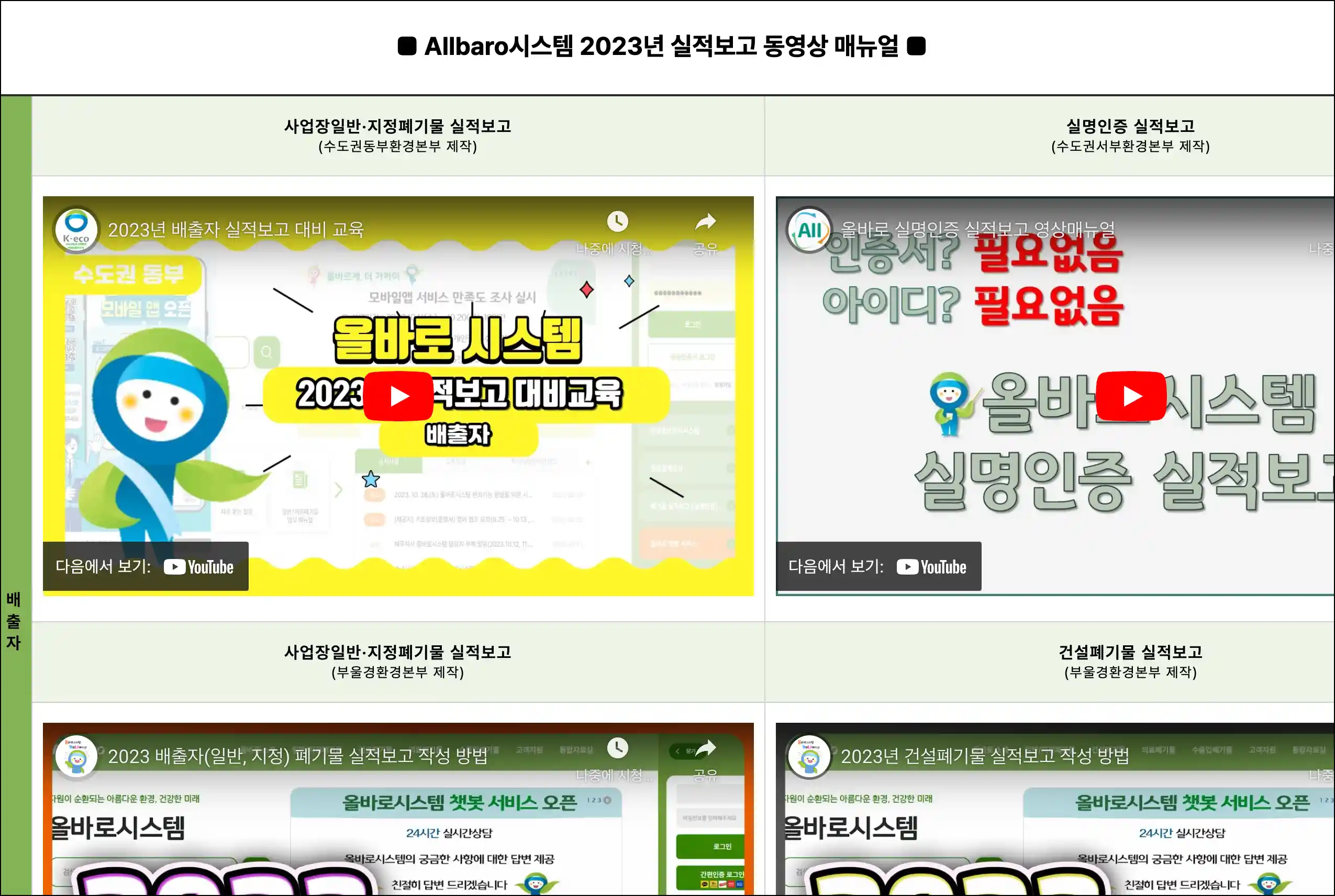 ■ Allbaro시스템 2023년 실적보고 동영상 매뉴얼 ■ 배출자 사업장일반·지정폐기물 실적보고(수도권동부환경본부 제작) 실명인증 실적보고(수도권서부환경본부 제작) 사업장일반·지정폐기물 실