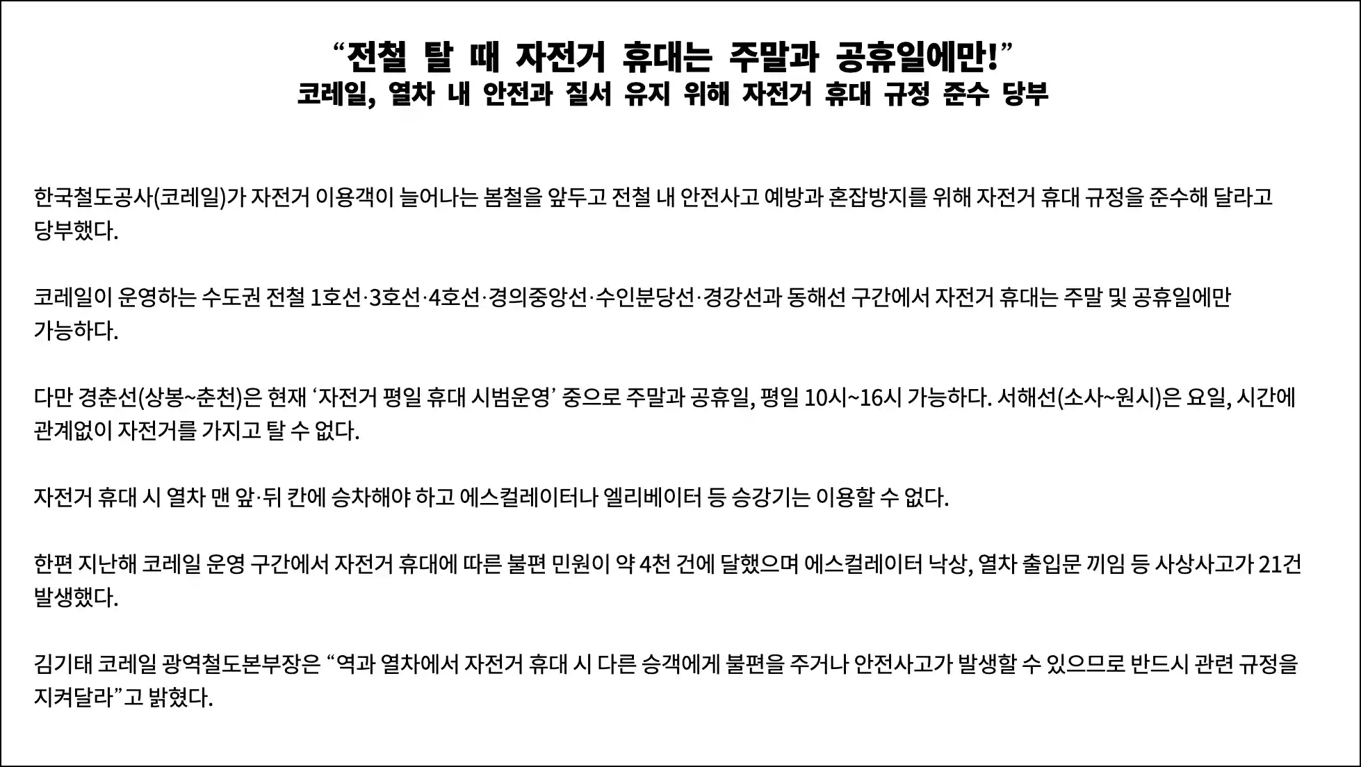 “전철 탈 때 자전거 휴대는 주말과 공휴일에만!” 코레일, 열차 내 안전과 질서 유지 위해 자전거 휴대 규정 준수 당부 한국철도공사(코레일)가 자전거 이용객이 늘어나는 봄철을 앞두고 전철